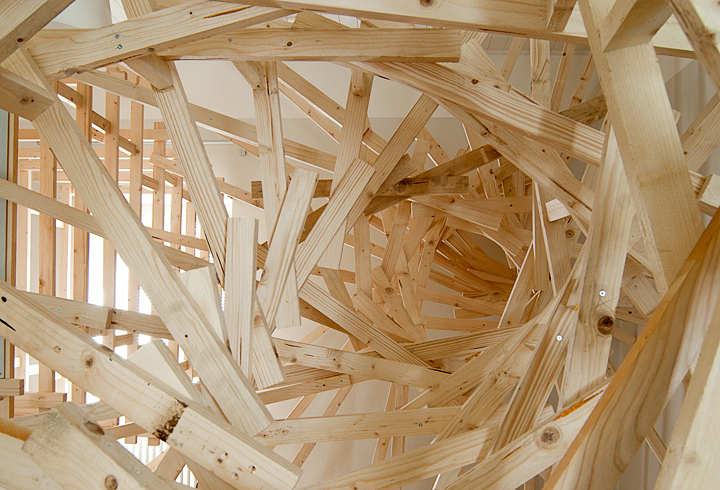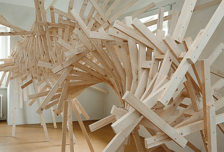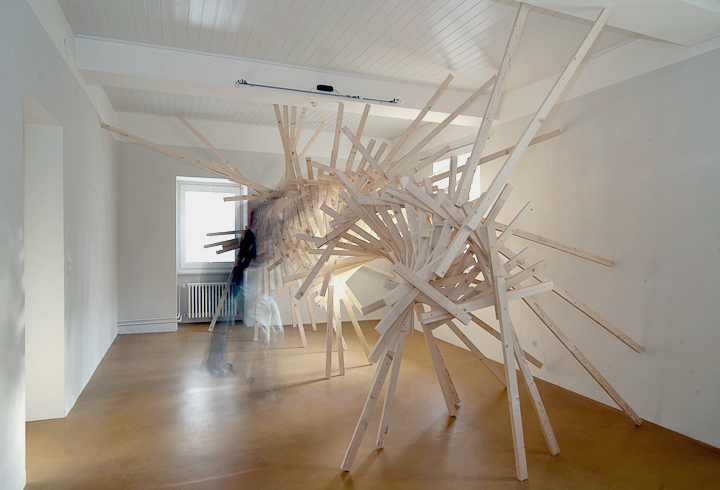 Die Bild-Räume werden durch eine repetative Gedankenform verziert. Die aus einem Achteckraster aufgebaute Dachlattenkonstruktion gliedert den Raum und schafft Ordnung durch Wiederholung. Das Ornament stillt ein alltes menschliches Bedürfniss mit Geometrie und Abstraktion ein vereinfachtes, reduziertes Bild unseres Daseins zu schaffen.